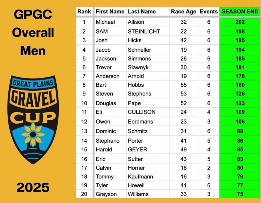 I scanned the results and the riders that finished just above and below me. It was going to be extremely close if I cracked the top twenty. After driving home that evening and doing some math. I finished 19th overall in the inaugural Great Plains Gravel Cup series. Goal achieved.